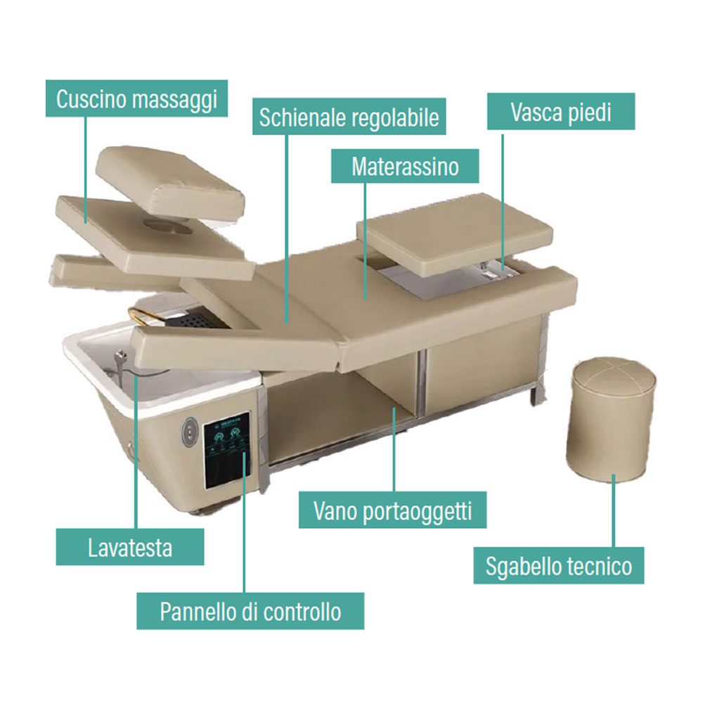 Multiuso: Head Spa, Trattamenti Viso, Corpo e Piedi. Massima versatilità e facilmente convertibile da postazione lavaggio Head Spa a lettino per trattamenti.