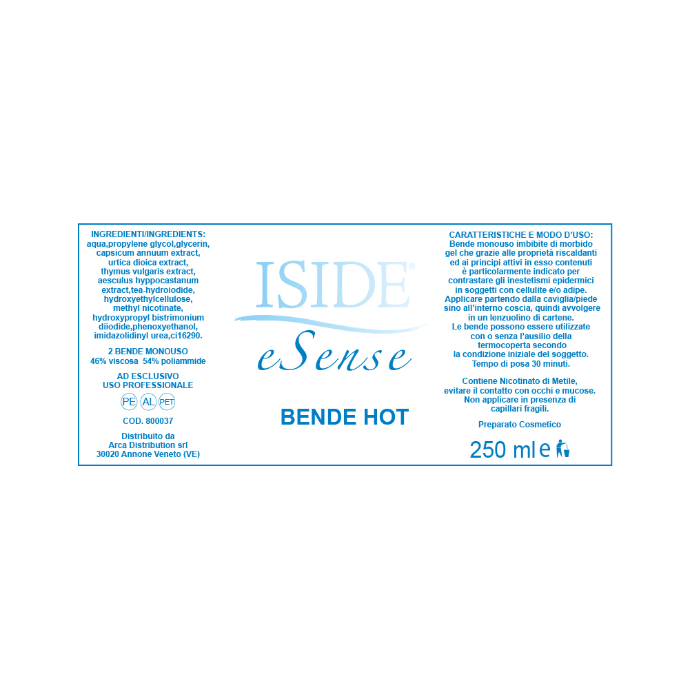 Bende hot monouso imbibite di morbido gel. Contenente agenti esteri dell'acido nicotinico che applicato sull’epidermide provoca un'apporto di calore. Indicato per contrastare gli inestetismi epidermici in soggetti con cellulite e/o adipe. Principi attivi: