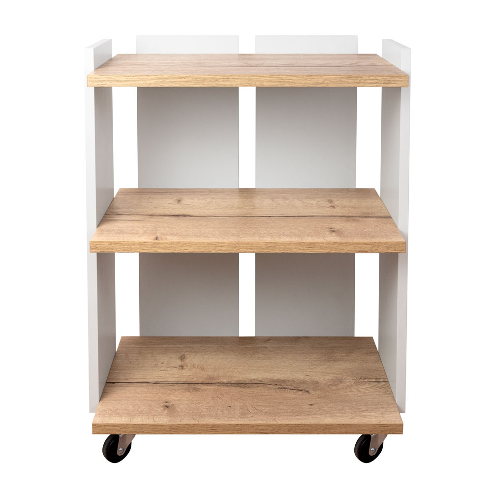 Carrello estetista in legno Made in Italy con struttura in impiallacciato bianco e tre ripiani in color rovere. Dotato di 4 ruote per un perfetto bilanciamento ed una facile movimentazione.