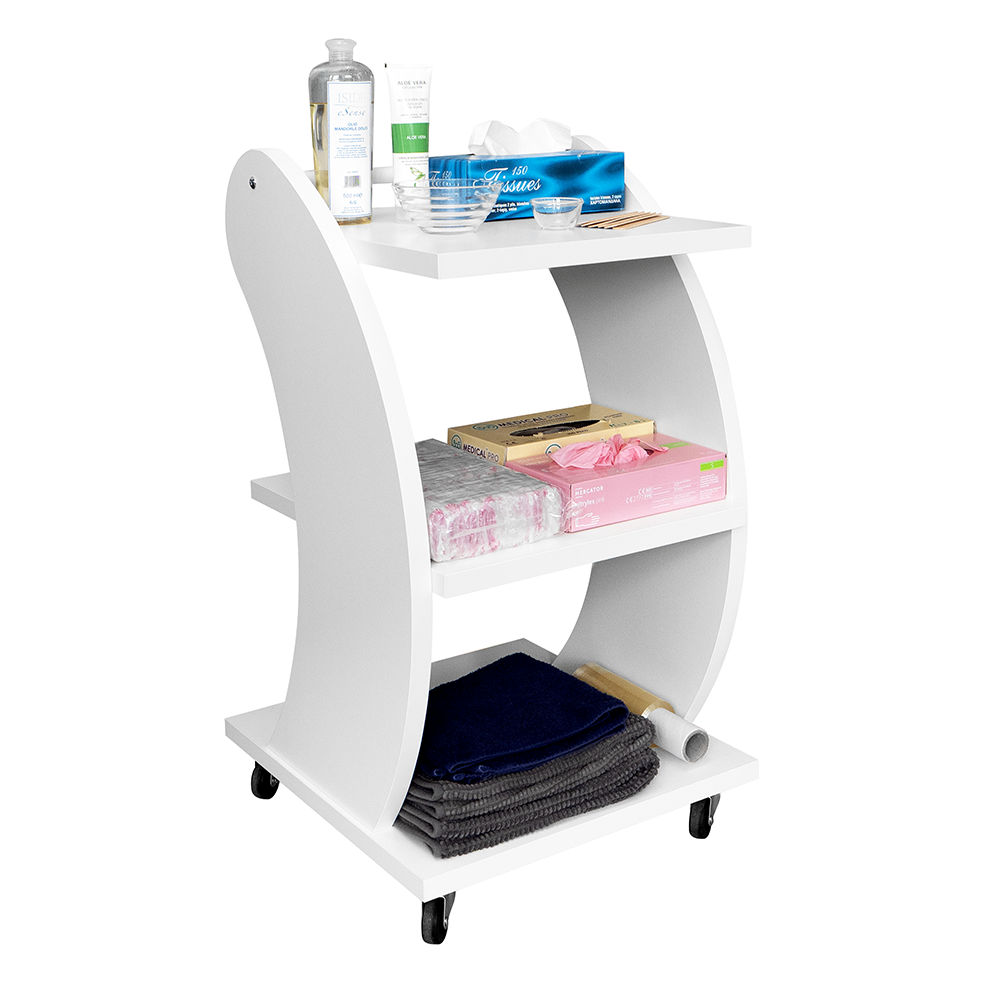 Elegante carrello estetista in legno Made in Arca con struttura in impiallacciato bianco in versione da 2 ripiani. Dotato di ulteriore ripiano di base per creare un terzo ripiano, maniglione metallico tinto bianco e 4 ruote per un perfetto bilanciamento ed una facile movimentazione. Ideale per appoggiare piccole apparecchiature o strumenti e accessori di vario tipo nei centri di bellezza.