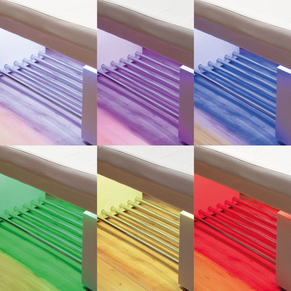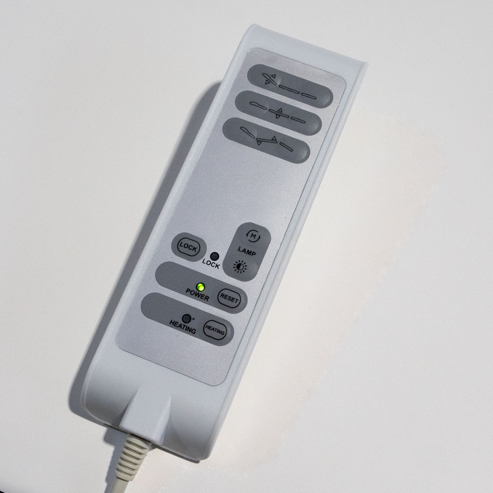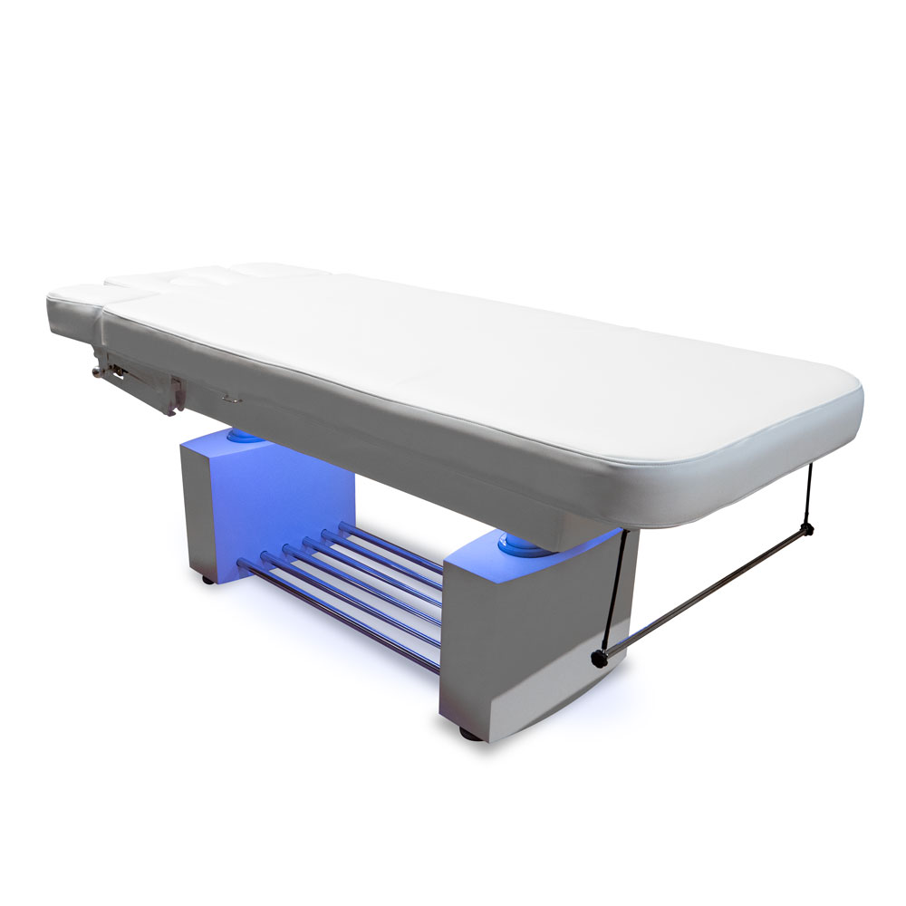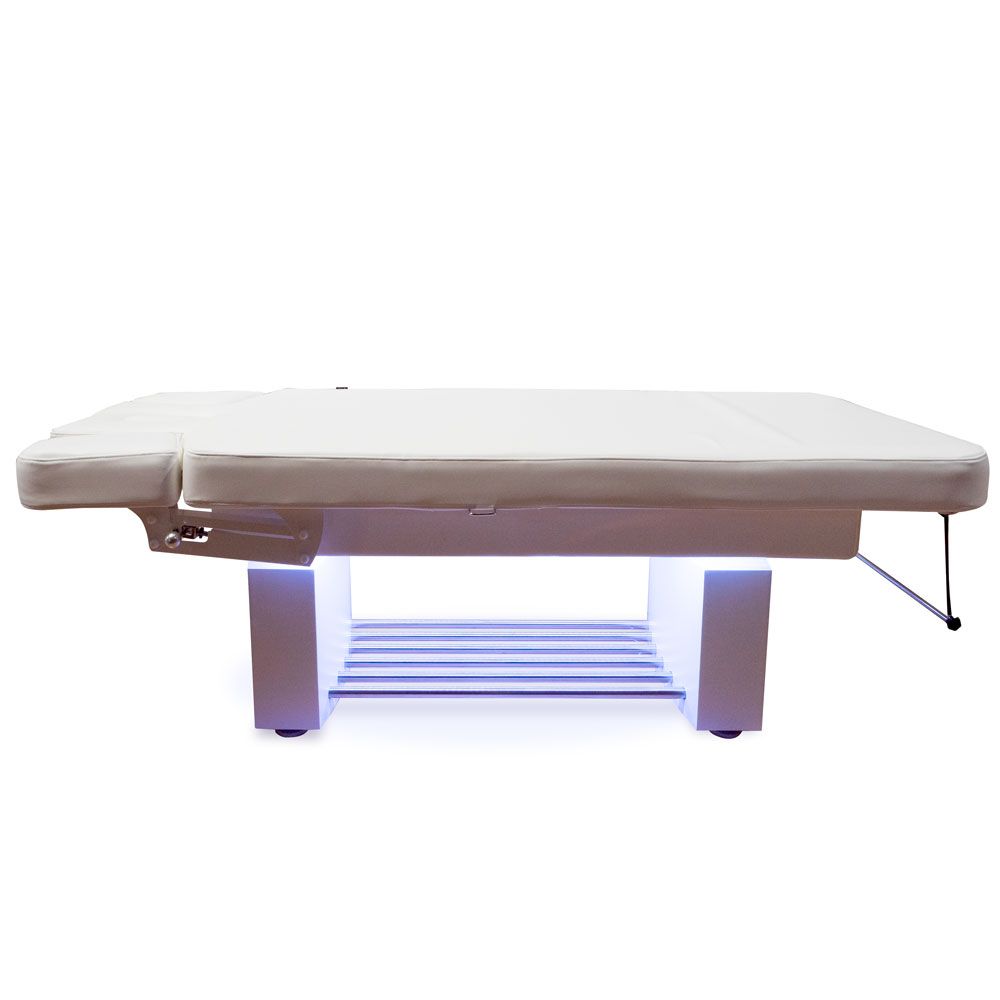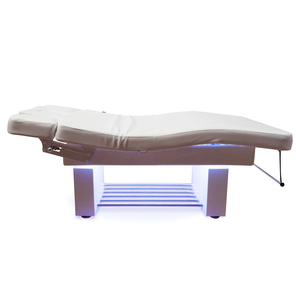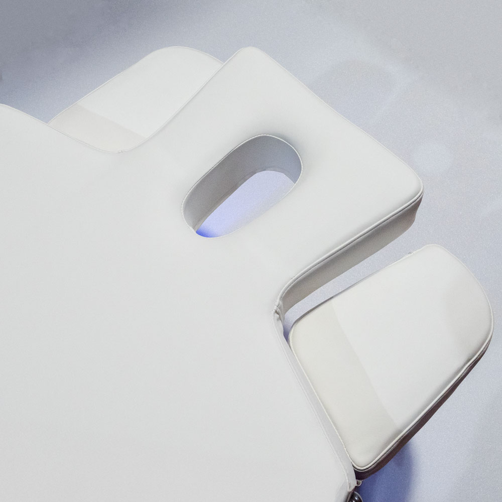 Il lettino dispone di cromoterapia (luci LED di differenti colori, v. immagini) e telecomando che agevola qualsiasi tipo di trattamento regolando l’altezza, i tre snodi, le luci LED e l’accensione/spegnimento del riscaldamento. Pedale disponibile come optional.