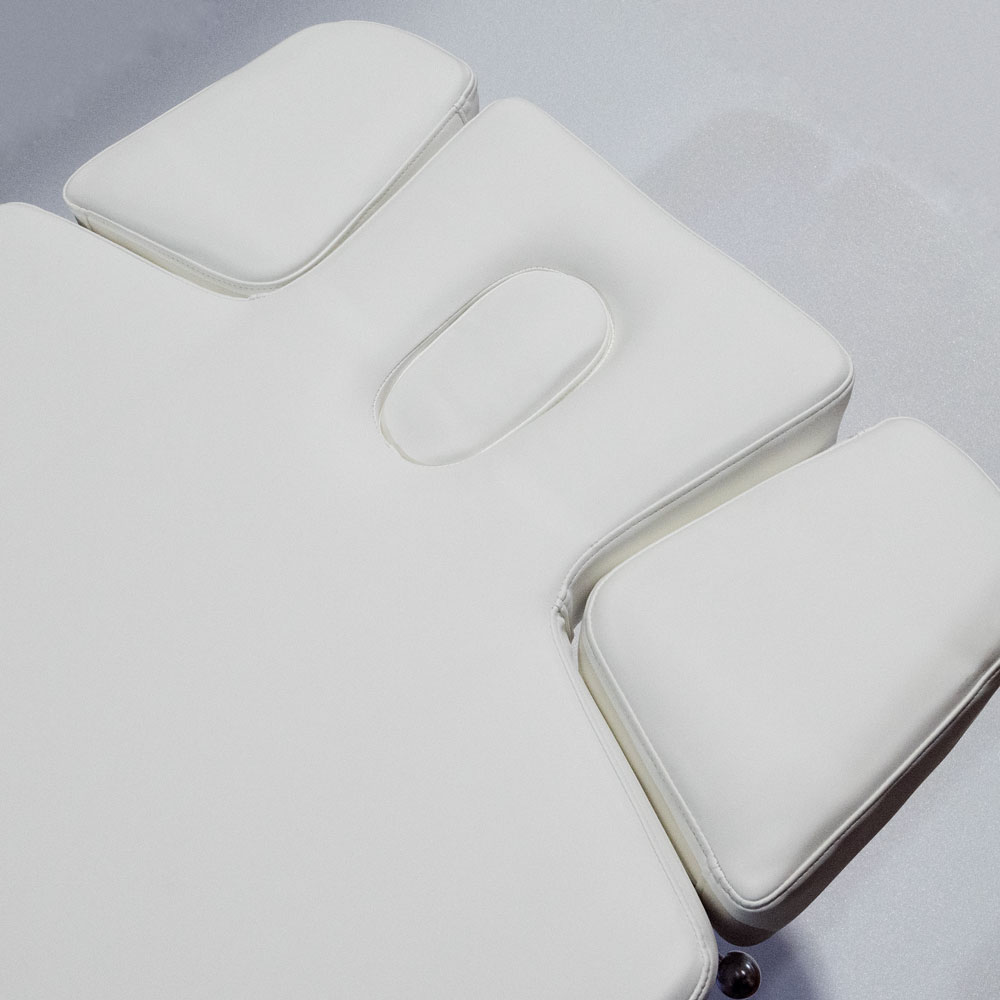 Il lettino è dotato di 4 motori che regolano l'altezza del lettino, l’inclinazione dello schienale (fino a 60°) e la pediera (fino a 25°). Poggia braccia regolabili manualmente. Completo di foro viso, portarotolo e ripiano per riporre strumenti e piccole attrezzature.