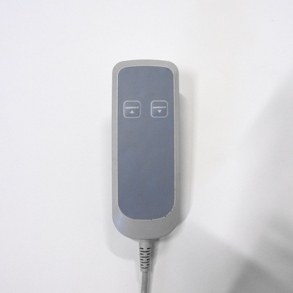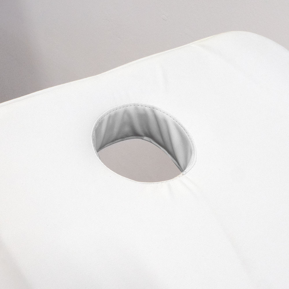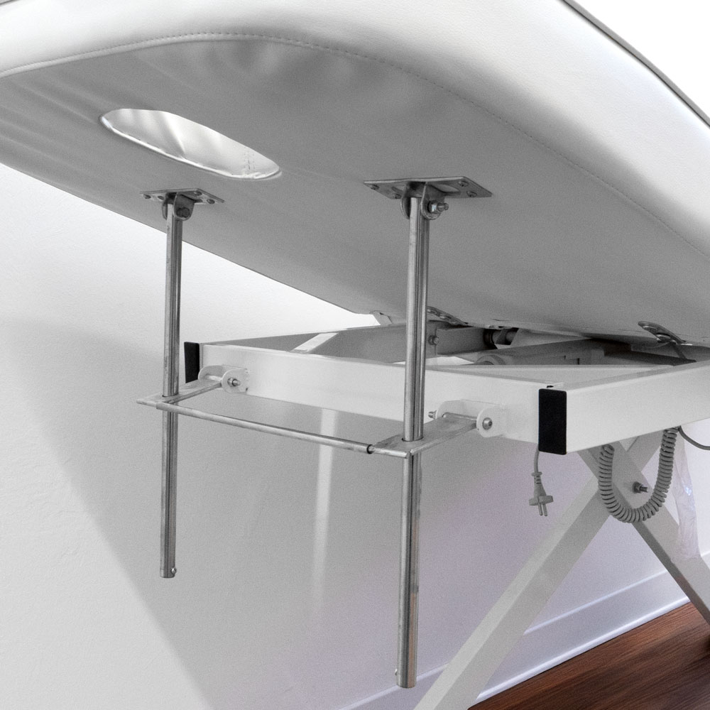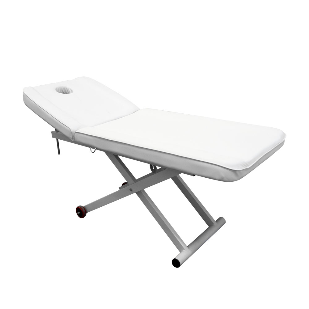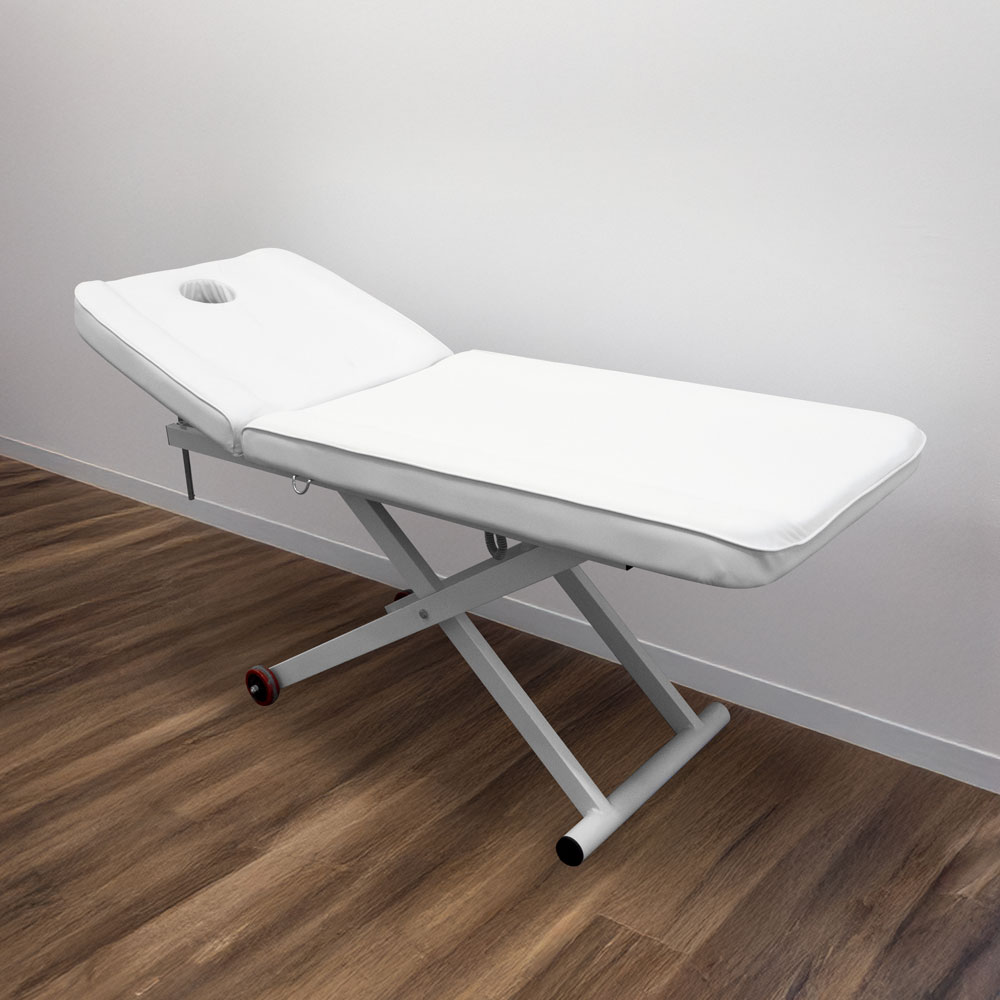 Lettino da massaggio rivestito in PU bianco, con altezza regolabile tramite telecomando. Inclinazione regolabile tramite pistone a gas.