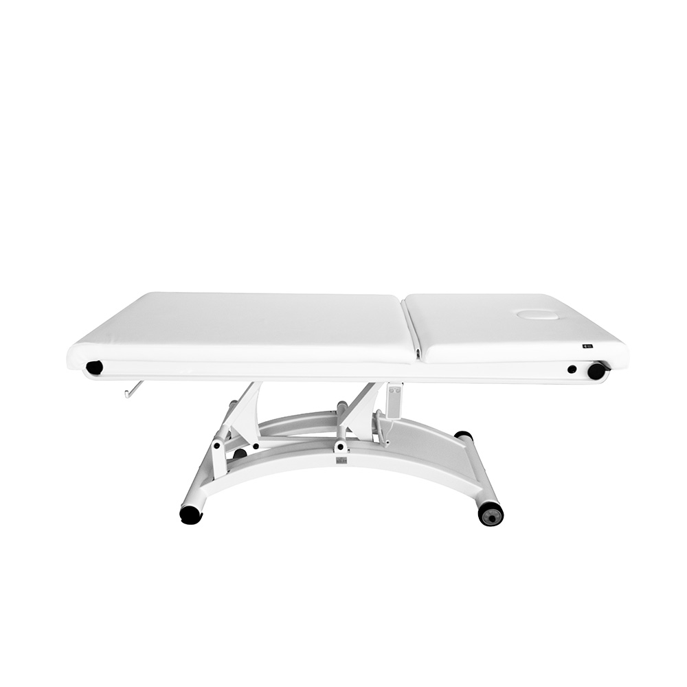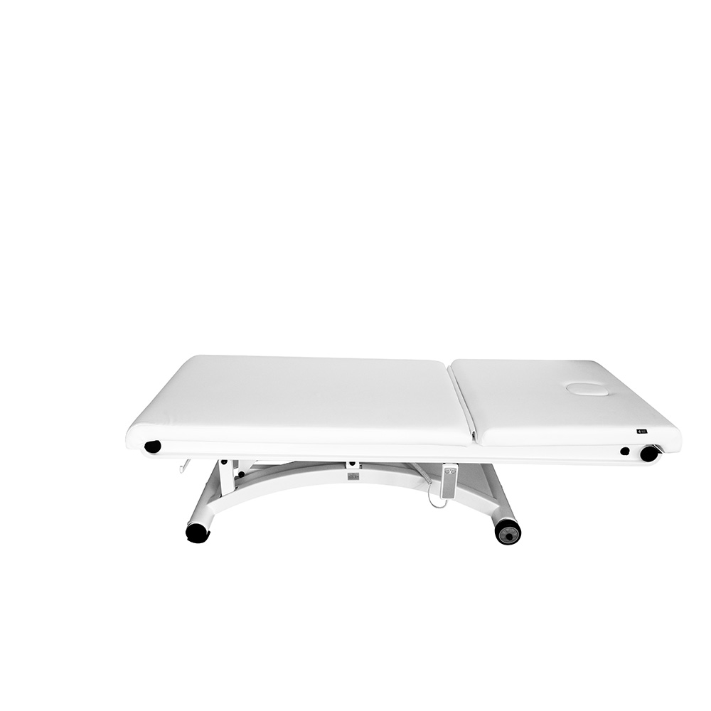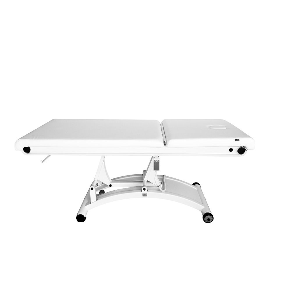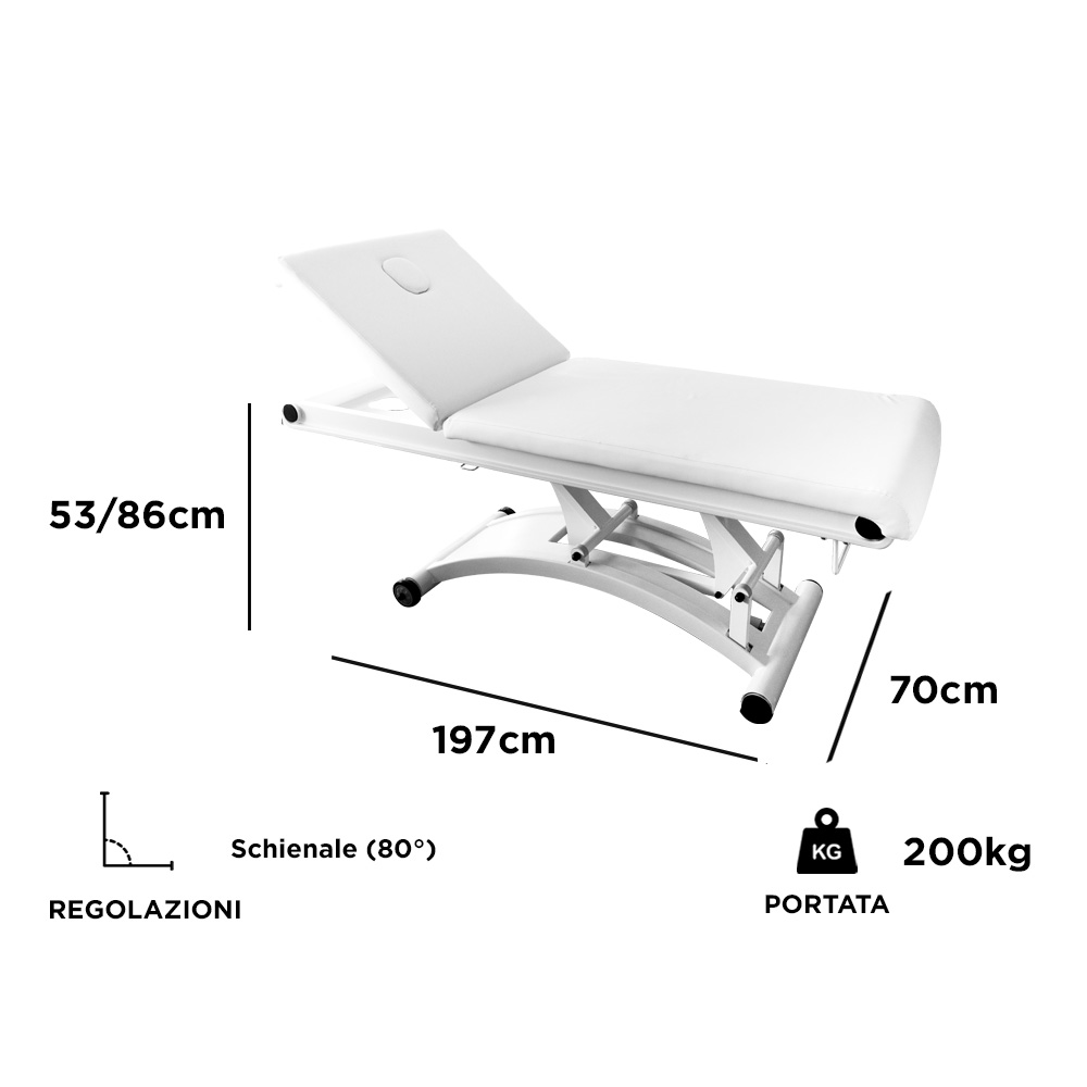 Lettino a 1 snodo dal design minimalista. È fornito di 1 motore per regolare l'altezza. L'inclinazione dello schienale è regolabile con un pistone a gas. Telaio metallico con base a forma di semisfera e 2 ruote incoporate che ne facilitano lo spostamento. Rivestimento in PU bianco di alta qualità e facile da pulire. Portarotolo incorporato.