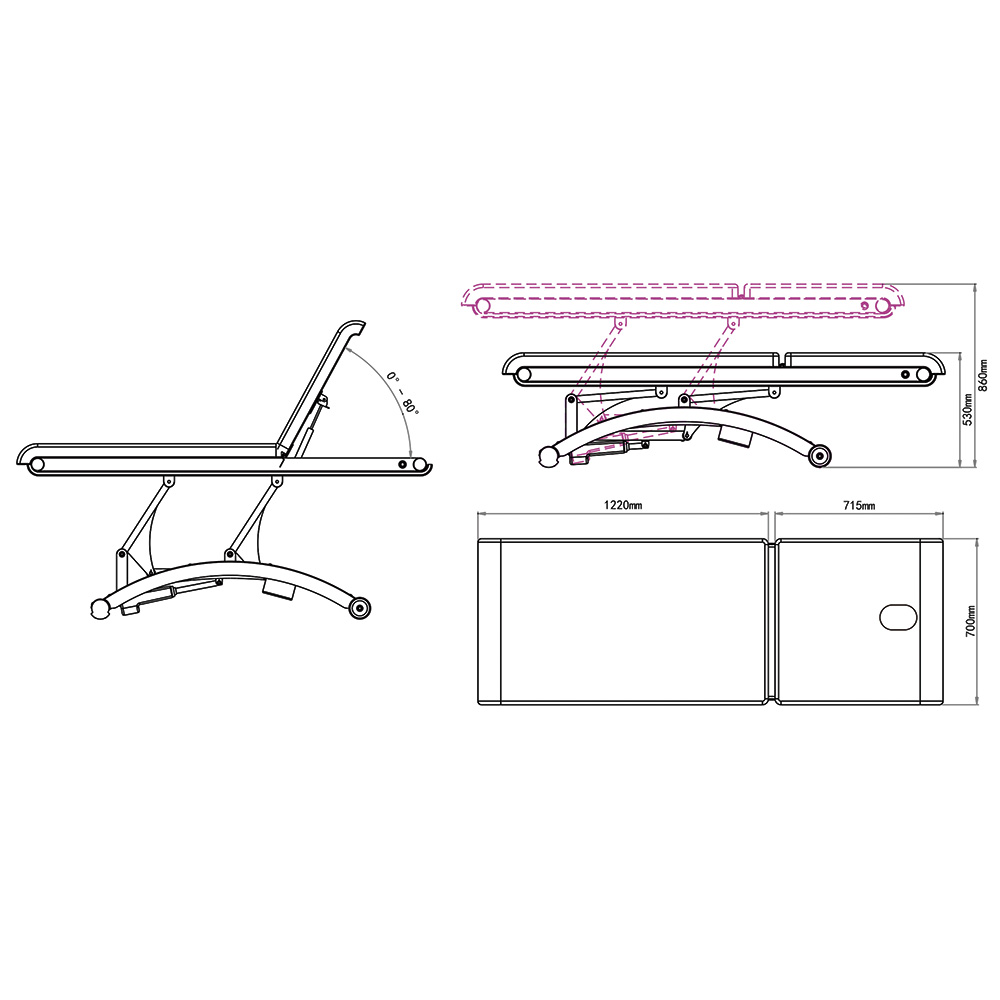 Specifiche tecniche Dimensioni: Lung. 1970 x Larg. 700 x H. 530/860 mm Peso: 71 Kg Motori: 1 Snodi: 1 Dimensioni Packaging: 202 x 75 x 60 cm