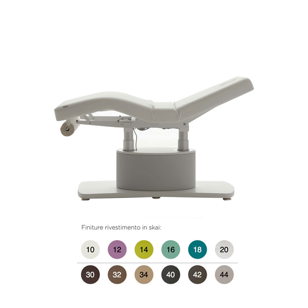 Lettino per massaggi eletrico doppia colonna, dotato di quattro motori.Si tratta di un lettino multifunzionale che si presta a qualsiasi tipo di trattamento grazie alle sue innumerevoli regolazioni.I movimenti di materasso sono gestiti da un comodo telecomando. Il materasso in skai è dotato di foro facciale con relativo tappo e portarotolo ed è disponibile anche nella versione con braccioli regolabili.Il basamento è bianco oapco; il materasso e il rivestiemnto dell'ovale in skai sono disponibili in 12 colori (standard bianco)