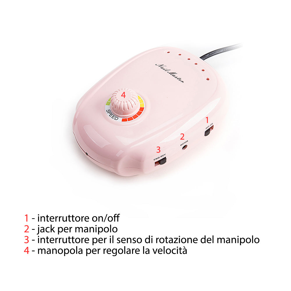 Micromotore con set di utensili per la limatura e decorazione delle unghie. La testina: