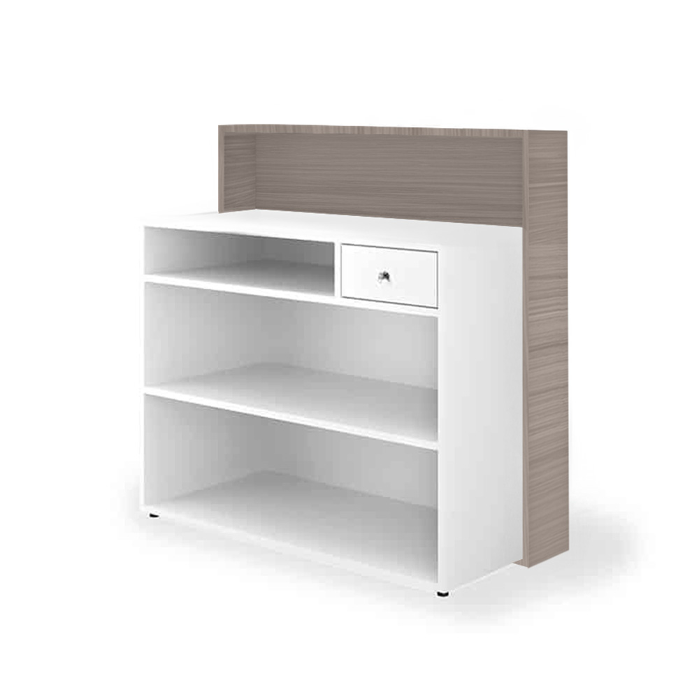 Mobile reception con struttura posteriore in nobilitato bianco di larghezza 48 cm, frontale disponibile in 5 colorazioni di larghezza 20 cm. Struttura frontale retroilluminata. Dotata di cassetto con chiusura con chiave e ripiani porta oggetti.