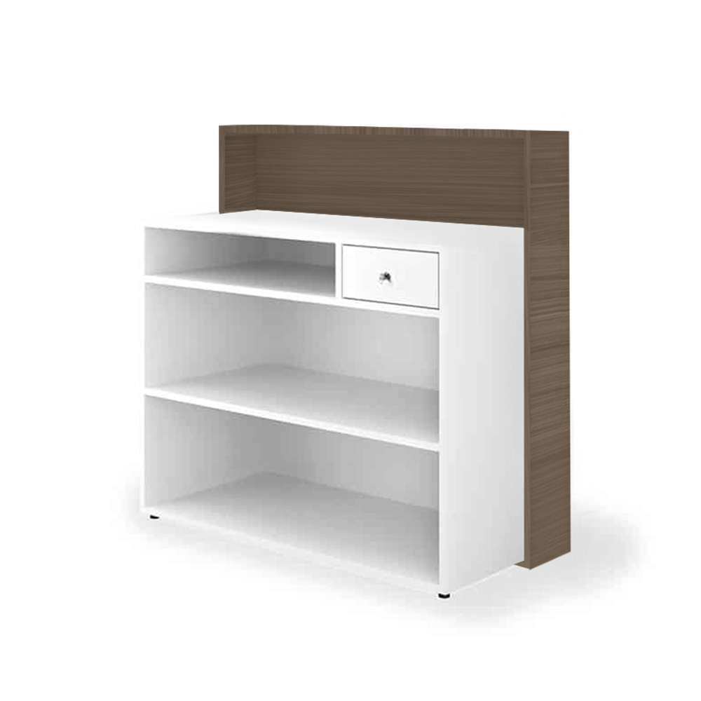 Mobile reception con struttura posteriore in nobilitato bianco di larghezza 48 cm, frontale disponibile in 5 colorazioni di larghezza 20 cm. Struttura frontale retroilluminata. Dotata di cassetto con chiusura con chiave e ripiani porta oggetti.