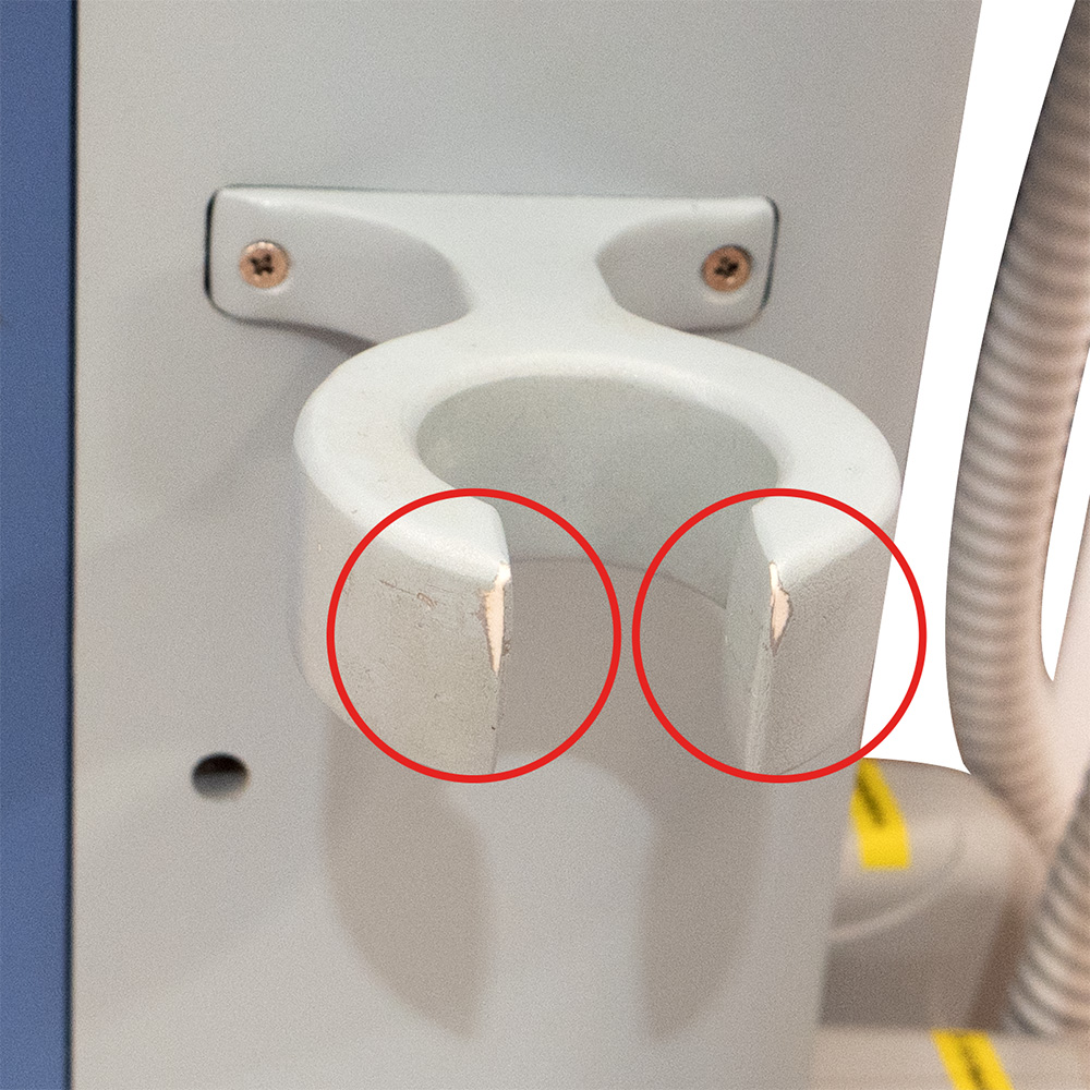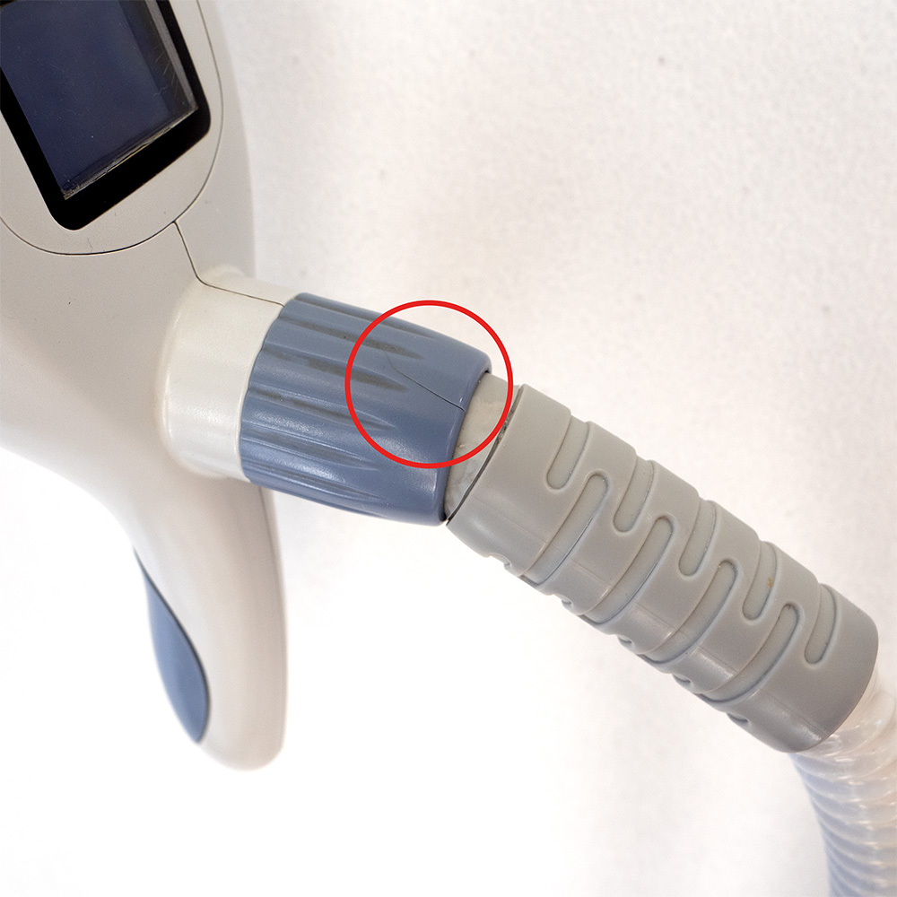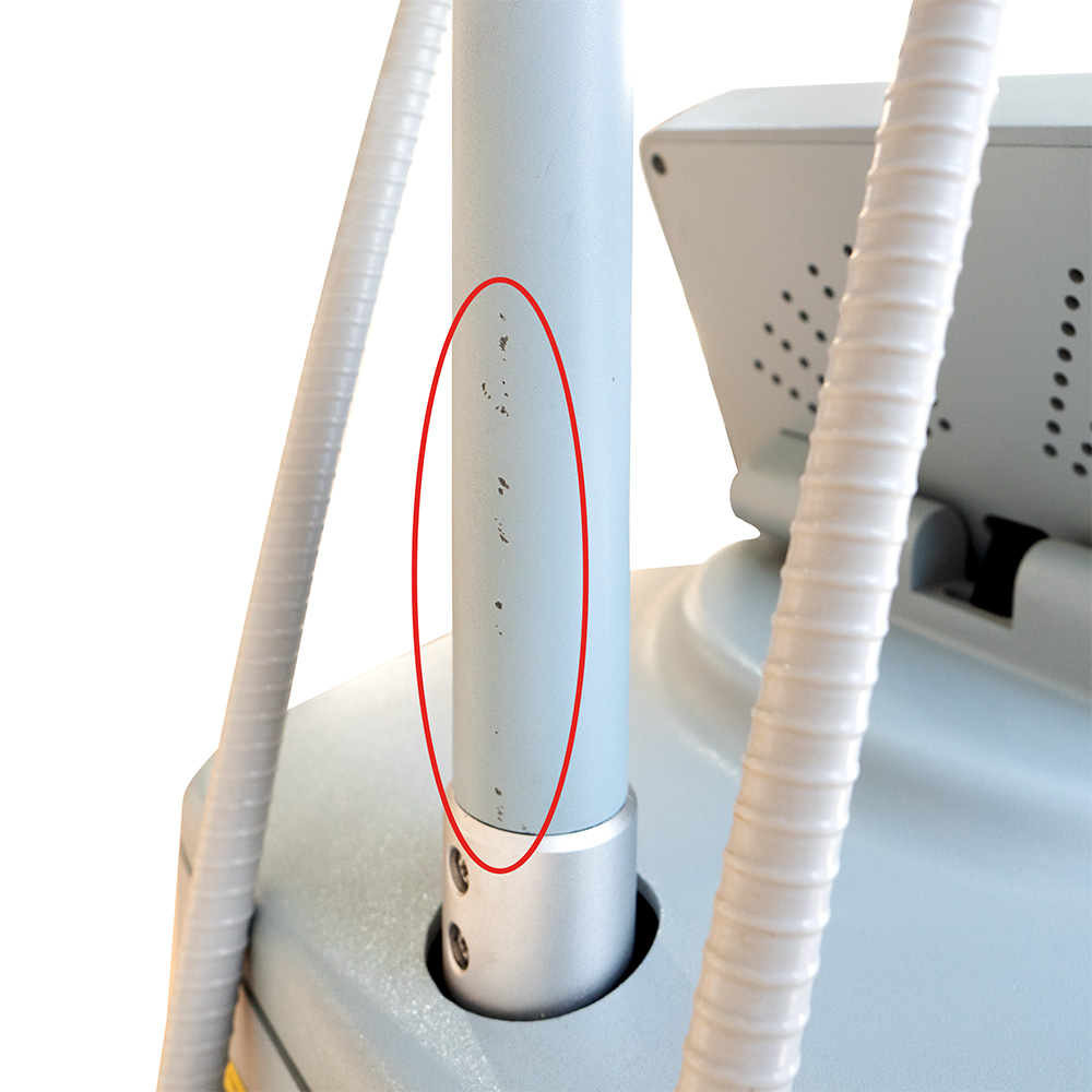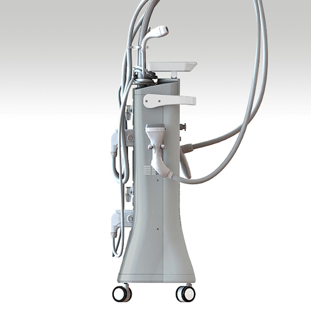Apparecchiatura carrellata dotata di 4 manipoli (2 per il corpo e 2 per il viso) con relativi supporti, display Touch Screen a colori e arresto di emergenza.