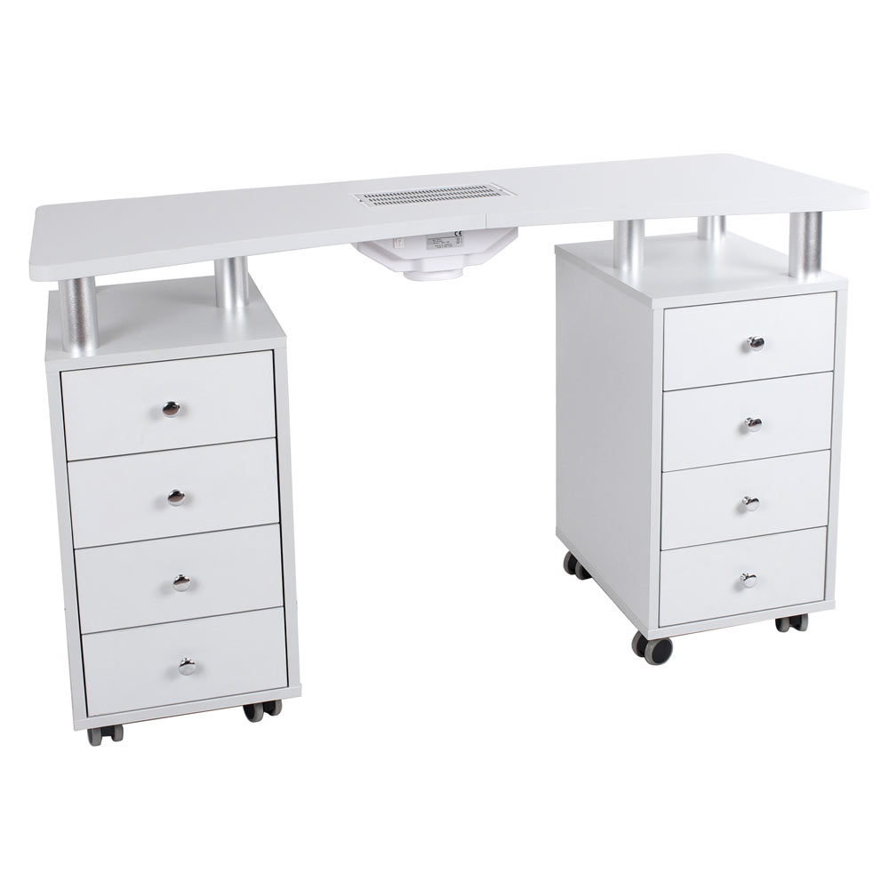 Elegante tavolo per manicure a doppia cassettiera e aspiratore 23W. Struttura realizzata in laminato bianco. Dotato di due colonne composte da 4 cassetti ambo i lati. 8 ruote piroettanti, che consentono lo spostamento del tavolo in maniera facilitata.